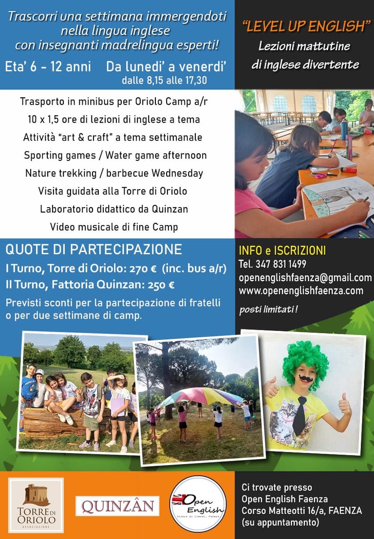 Nel pomeriggio, le attività artistiche e creative includono escursioni nella natura, sport, musica e teatro, offrendo ai partecipanti l’opportunità di immergersi nella lingua inglese e comunicare in modo spontaneo e naturale!
